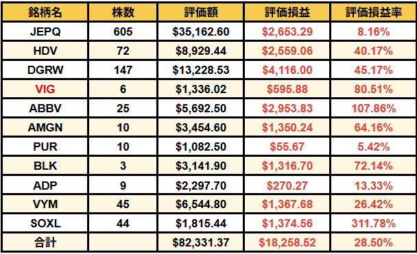 ※赤文字の銘柄は配当金再投資で購入した銘柄になります。