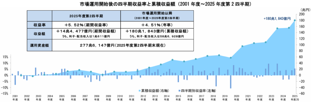 GPIFの運用開始からのトータルの成績は平均+4.51%で、180兆1,843億円になります。