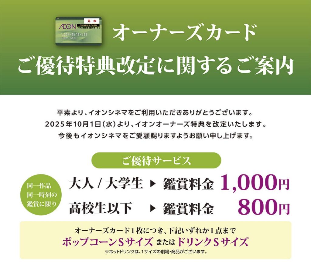 以前、特典が改悪されて、イオンシネマでポップコーンまたはドリンクの無料は廃止されました。